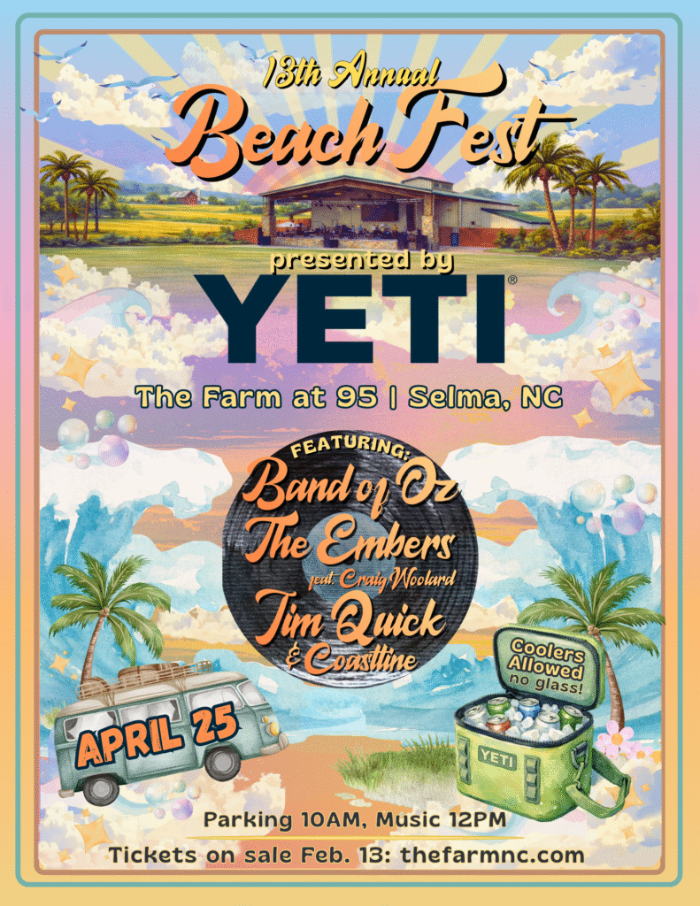 Join us for the 13th Annual Beach Fest, a laid-back, outdoor music festival that kicks off spring in the best way possible! This beloved annual event brings together live beach music, great company, and an all-day festival atmosphere at The Farm at 95, one of Eastern North Carolina’s premier outdoor event venues.