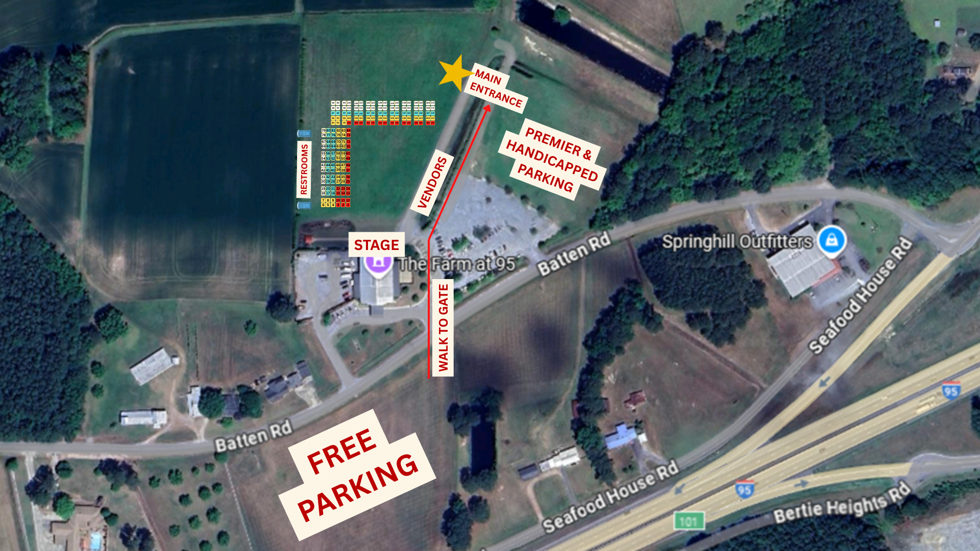 We offer Premier Parking for $20 (same side of the road as the venue and closest to the gate), as well as free parking across the street. You can refer to the map above for an overview of the grounds.